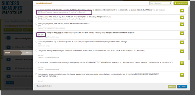 The Insert Questions window will display a list of every question in your question bank. For any question in this list, you can see what tool uses the question (the tool name is listed in grey below the question) and what languages are offered (EN/SP are listed in grey right after the question).