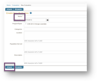 Be specific enough in your Evaluation Name that it will make sense to you and other staff, such as “Main Street Building Observations” or “Revitalization Initiative Resident Survey”.