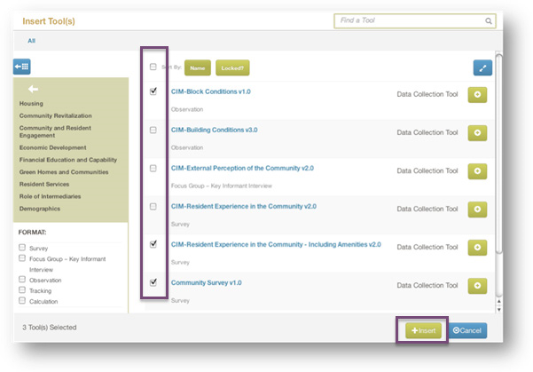 From here, you will see a list of every tool in your tool set. You can filter by a tool name, or scan the list for the tool you would like to insert. You can insert multiple tools at the same time.