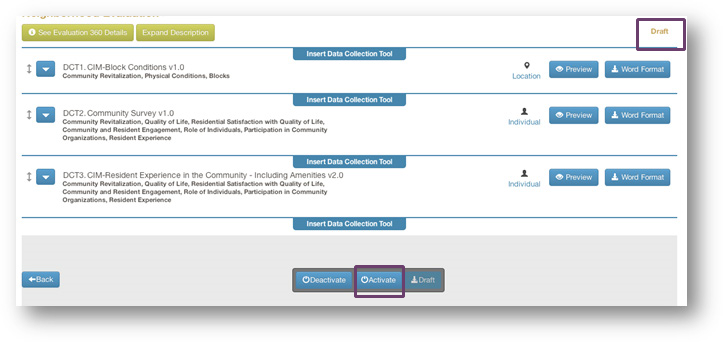 After your tools are inserted and the information source is selected, you need to activate your evaluation so data can be entered. This will take your evaluation out of draft mode.