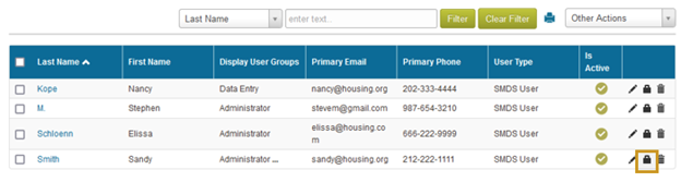 - To reset a user password, click the Lock icon to the right of that user’s name.