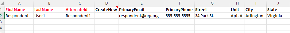 - Row 2 provides an example of what respondent information would look like in this worksheet. Please delete that row before uploading the worksheet with your own data.