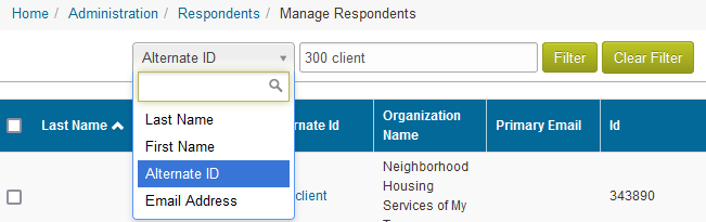 - You can search for a respondent using their last name, first name, alternate ID, or email address. Use the drop-down menu next to the search box to change how you want to look up the respondent.