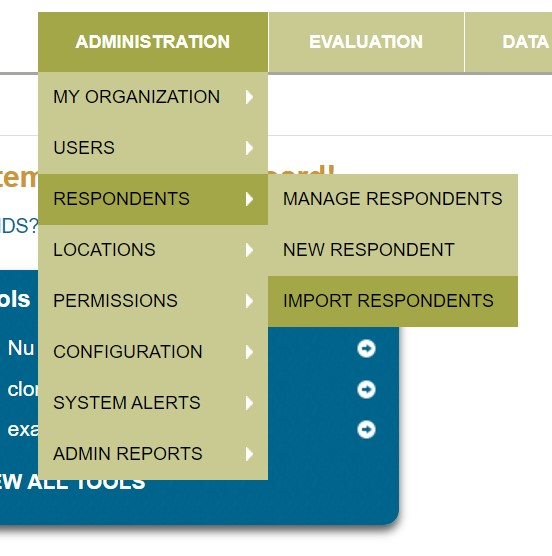 The system also allows you to import respondents into the system without any direct current connection to a specific evaluation, in anticipation of linking these respondents to a future evaluation. This can be useful, for instance, if you know that you will be surveying all program participants and want to import their demographic and other basic information prior to implementing the survey. These steps below will show you how to do that. Like the other importing processes, it uses a system-generated Excel template.