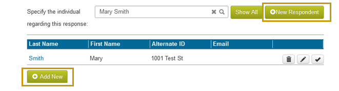 - If the respondent you want to enter a response for does not appear in the system, you can create a new respondent using the green +New Respondent button to the right.