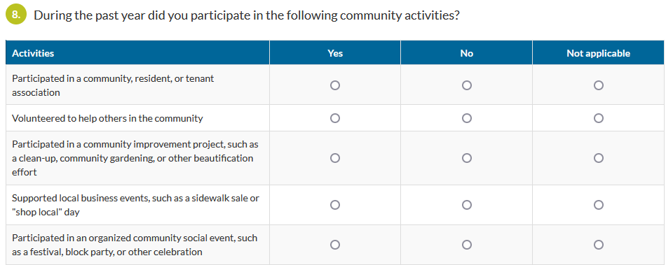 - As you proceed through the data entry of your response, you can leave any question blank that the respondent did not answer. Open-ended questions have text boxes you fill by typing in the words that the respondent wrote on their paper survey. Multiple choice questions that are “check all that apply” will have check boxes. Multiple choice questions that are single choice will have radio dials and you can only select one. Matrix questions are those set up on a survey or observation as a table with several rows of options and multiple columns of answer options. You will fill those in as the respondent did on the paper (see example Matrix below).